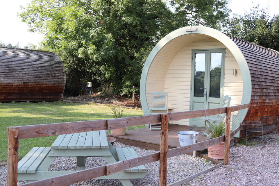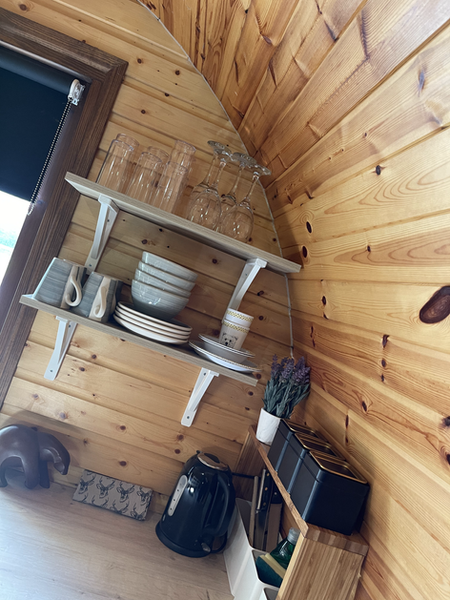 The pod has a double bed and a bunk bed for children. (suitable for under 10'S only) To make this family friendly it now has a TV with DVD. It has a small fridge, and kettle with tea and coffee. We have also provided plates, bowls and cutlery. All bedlinen will be provided in the pod.